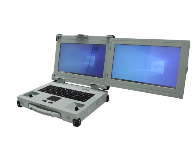 產品搭載Core™ I9-12900T處理器,默認32GB內存,搭配1TB容量SSD,兩個15.6寸高清分辨率1920 x 1080顯示屏,獨立顯卡,配有兩個雙軸搖桿。鋁合金材質,全加固抗震設計,-20° C ~ +50° C寬溫工作。